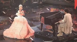 ピアノに向かって座り、力強くピアノを弾きながら『燃えよ』を披露。